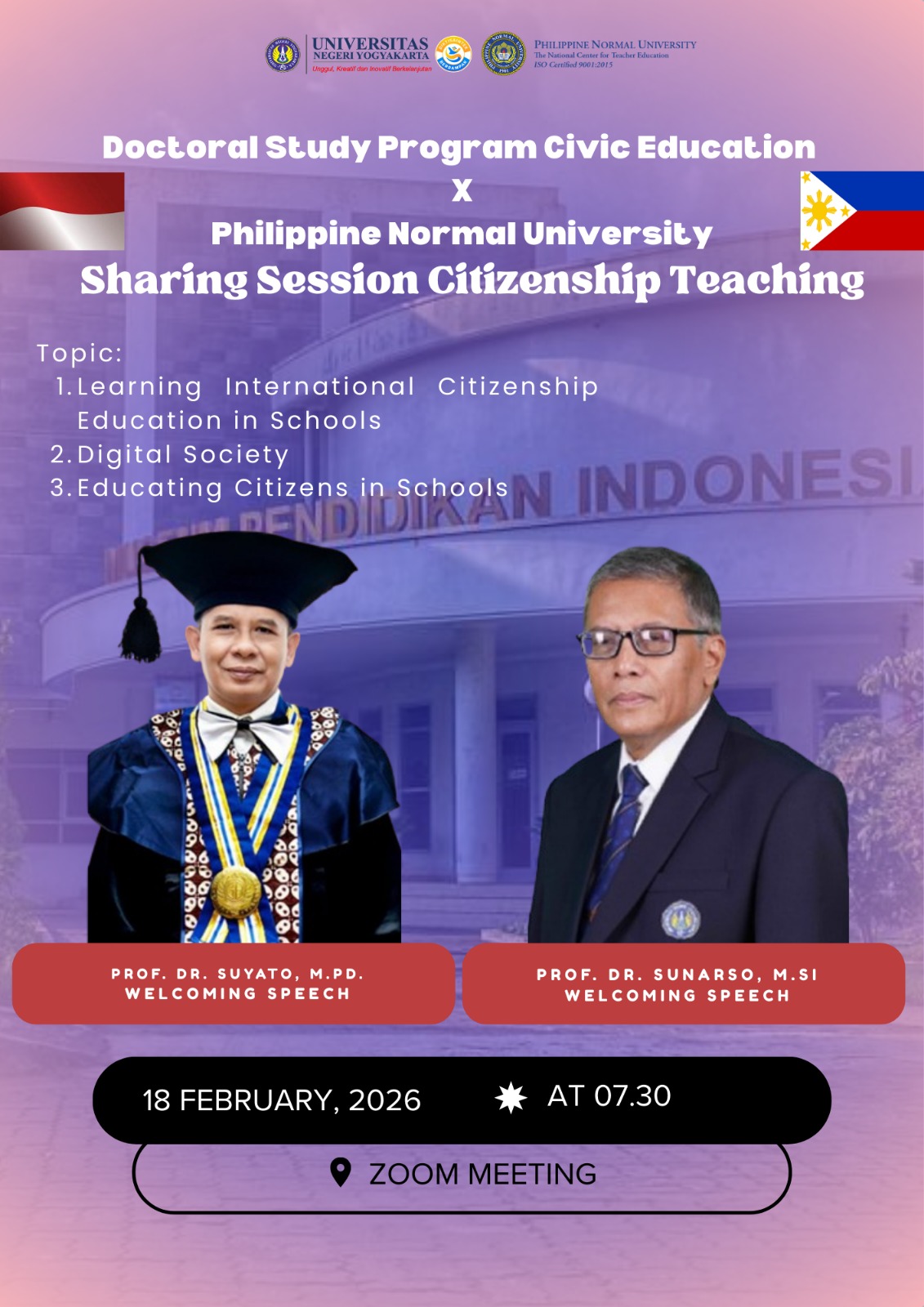 .Yogyakarta, 18 February 2026 – The Doctoral Study Program in Civic Education successfully held an international academic sharing session in collaboration with Philippine Normal University. Conducted via Zoom Meeting at 07.30 AM, the event marked a significant milestone in strengthening cross-border academic engagement in the field of citizenship education.